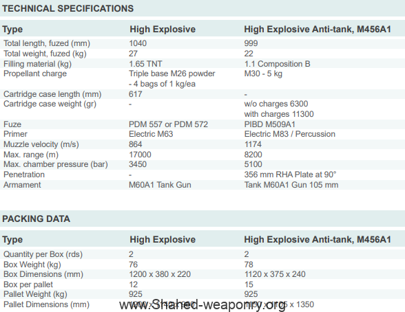 GENERAL SPECIFICATIONS (HEAT M456A1) This is fixed round high explosive anti-tank ammunition intended to be used against armored targets. The ammunition consists of a steel body projectile and a brass case containing the propellant charge. The body contains a funnel shaped copper liner, a PIBD fuze at the bottom, a nose cap retaining piezoelectric element and is loaded with composition B. When the projectile is detonated on impact by fuze functioning, the cone collapses, creating a high velocity shock wave and a jet of metal particles which penetrates the target.GENERAL SPECIFICATIONS (HE-TK-M60) The product is high explosive ammunition with the projectile secured to the brass cartridge case and is fired with M60 series tank guns. Having a muzzle velocity of 864 m/s the projectile reaches a max range of 17,000 m in the field being effective against enemy’s personnel and materials by producing both fragmentation and blast.