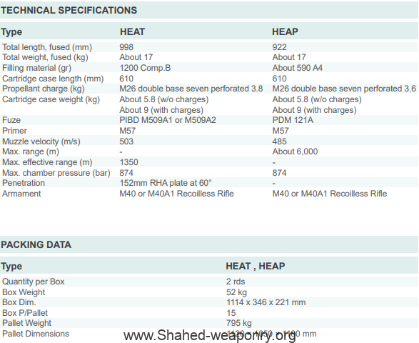 GENERAL SPECIFICATIONS (HEAT M344A1) This product is provided in two types as HEAT and HEAP. The HEAT type is applied against tanks and armour vehicles. It is fired with Recoilless Rifles M40 or M40A1. The base of the projectile of the HEAT type contains the PIBD M509A1 fuze and the fin assembly. The cartridge case has a steel perforated body and contains the propellant charge fitted with a percussion primer at the base. General Specifications (RR – HEAP) This product is provided in two types as HEAT and HEAP. The HEAP type is applied against enemy’s personnel. It is fired with Recoilless Rifles M40 or M40A1. The base of the projectile contains the PD M121A fuze and the fin assembly. The cartridge case has a steel perforated body and contains the propellant charge and fitted with a percussion primer at the base.