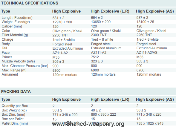 The high flexibility and easy handling on one hand and the accuracy of operation on the other hand, have made mortars to be considered as the most worldwide suitable weapon in infantry fighting, particularly in hilly or jungle terrains fields. The 120mm mortar shell is one of mortar bombs produced by Iran Defence Industries and characterized by the special process of production and high quality material for the body, resulting in more effective blast and fragments and higher lethality for the ammunition. It is equipped with AZ111-A2 fuze with 2 positions (delayed and quick impact). Long range: Long range type of 120mm mortar bomb is an improved type of that. The new type has more explosive power and as a result causes much better fragments than the previous type, resulting in a better performance. All these improvements are made without any change to the mortar launchers. Above-surface high explosive 120 mm mortar bombs: In this kind of mortar shell the basic fuze AZ111-A2 is replaced with AZ111-A2/ AS. In case of not using above-surface mechanism it will work as an ordinary 120mm mortar shell, but in case of setting fuze to immediate position and using above-surface mechanism, fragments that impact target will increase 30% more and this means that effectiveness of mortar is increased.