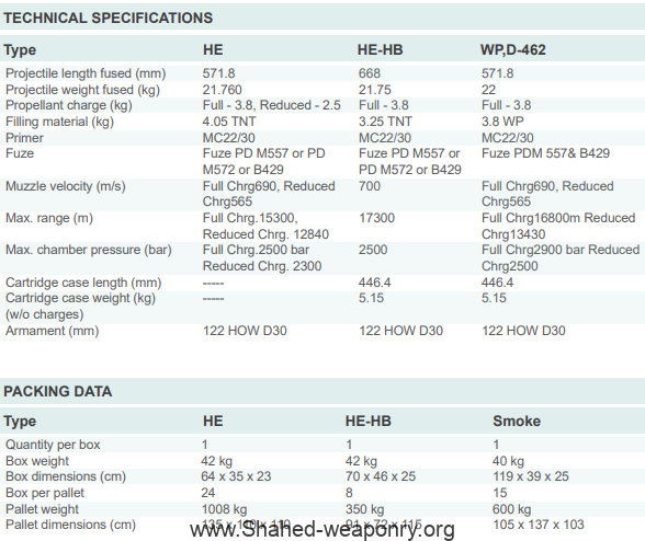GENERAL SPECIFICATIONS (HE) 122mm Howitzer Ammunition series are semi-fixed and widely used all over the world since World War II as reliable artilleries in military services. High Explosive of-462 intended for use with D-30 Howitzer Gun. GENERAL SPECIFICATIONS (HE-HB) 122 mm Howitzer Ammunition series are separate loading munitions widely used all over the world since World War II as reliable artilleries in military services. High explosive hollow base is intended for use with D-30 Howitzer Gun.GENERAL SPECIFICATIONS (SMOKE, WP) 122 mm smoke ammunition uses WP to conceal and spot by limited incendiary effect. The ammunition is semi-fixed; the cartridge case is loaded separately so that where appropriate, the propellant charge can be altered to suit the fire mission.