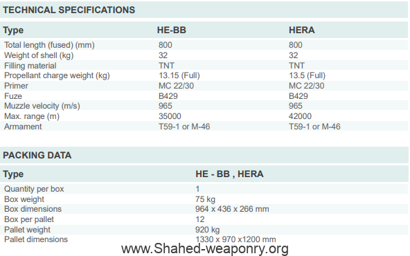 GENERAL SPECIFICATIONS (HE – BB) 130mm gun ammunition HERA are semi-fixed series of munitions provided in various types as high explosive, extended range, smoke and illuminating. The range of HERA – BB type is 42000m.General Specifications (HERA – BB) This is an improved type of 130mm HE-BB ammunition which has a different aerodynamic shape in comparison with the normal one and is equipped with a gas generating system at its base is called Base Bleed Unit. The generated gas replaces the vacuum created at the rear side of the shell and therefore results reduction of the drag force and consequently a remarkable increasing in the range which is around 35000 m at 1000 m above sea level.