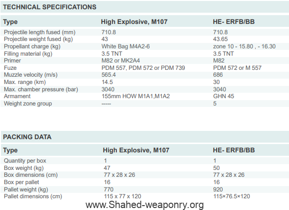 GENERAL SPECIFICATIONS (HE, M107) 155mm HOW ammunition series are supplied in HE, M107, extended range with base bleed unit, as well as smoke and illuminating types. The range of HE type is 16 km.GENERAL SPECIFICATIONS (HE- ERFB/BB) 155mm HOW ammunition ERFB/BB is equipped with base bleed unit resulting to an enhanced range of 34 km. The ammunition is fired with GHN45 GUN.