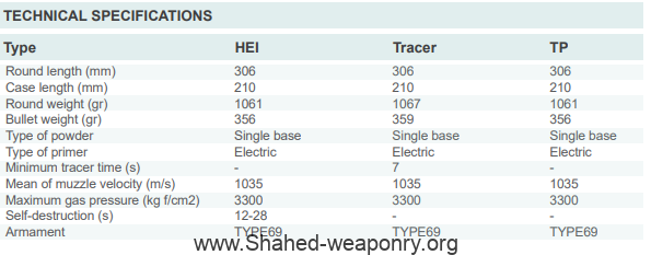 GENERAL SPECIFICATIONS (HE) This ammunition is produced to be used with 30mm AK630 naval gun intended for short range defense of warships or as the main armament of small vessels. The HEI type of this ammunition is equipped with self-destruction device with duration of 12 to 28 seconds and is primed electrically.GENERAL SPECIFICATIONS (TRACER) This ammunition is produced to be used with 30mm type 69 or AK630 naval gun intended for tracing purposes. The tracer of this ammunition burns for at least 6 seconds.GENERAL SPECIFICATIONS (TP) The Target Practice (TP) type of 30mm anti-aircraft naval ammunition is produced to be used with the same gun as HEI and tracer types and intended for training purposes. The round ballistically matches the HEI type.