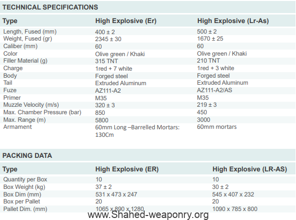 GENERAL SPECIFICATIONS ER-HE: Extended range high explosive 60mm mortar is designed to improve range and performance, but launcher in this type is different and a long-barrelled mortar is needed.Above-surface long range high explosive 60mm mortar bomb In this kind of mortar shell the basic fuze AZ111-A2 is replaced with AZ111-A2/AS. In case of not using above -surface mechanism it will work as an ordinary long range 60mm mortar shell, but in case of setting fuze to immediate position and using above -surface mechanism, fragments that impact target will increase 30% more and this means that effectiveness of mortar is increased.