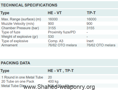 GENERAL SPECIFICATIONS (HE-VT) 76/62mm naval ammunition is a high explosive round intended for firing against a wide range of targets either surface, coastal or in the air. It is used against surface and coastal targets by a point detonating fuze, and against air targets by a radio proximity fuze. GENERAL SPECIFICATIONS (TP-T) The training projectile 76.62mm naval ammunition is produced for training purposes.