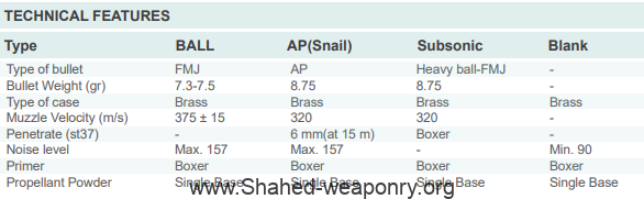 GENERAL SPECIFICATIONS (BALL) This cartridge has a rimless straight – tapered case with boxer priming.General Specifications (AP(SNAIL)) This cartridge has a rimless straight – tapered case with boxer priming. The bullet is made of brass and hard steel optimized to penetrate body armor.General Specifications (SUBSONIC) This cartridge has a rimless straight – tapered case with boxer priming. The heavy bullet subsonic rounds are used by suppressed weapons.General Specifications (BLANK) This cartridge has no projectile but produces a loud report, it is used for alarm and training. The Material case of this Cartridge is brass and a depression in the neck is crimped.