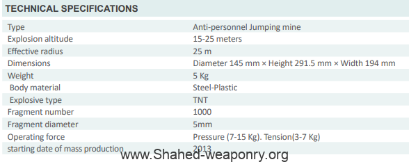 Ababil is an anti-personnel fragmentation jumping mine (top attack) which has the ability to jump about 60 meters height. This product is considered as a big achievement in defense tactics. When the mine reaches its maximum height, the warhead will descend by a parachute and explode in 15-25 meters height. After explosion, the fragments will be scattered toward the enemy. Mine fragments form 5-millimeter balls covering an area about 50 meters in diameter.