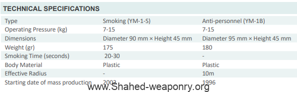 APPLICATION (YM-1-S Smoking) YMI-S is used for training, warning or alert during military maneuvers. This mine can be laid like normal anti- personnel mine which is activated by 7-15 kg force and then will release smoke in 30 seconds. There are four types of this mine in four different colors: red, blue, orange and green marked by their pressure plate color. These mines are used to evaluate the performance of mine fields and army. APPLICATION (YM-1B) YMI-B is a resilient plastic-cased scatterable anti-personnel blast mine fitted with a pressure fuze. YMI-B is provided with an anti-shock device and fitted with an arming knob offset from the center of the base. The knob has two modes: ”A” (armed) and “S” (safe) to block the movement of the pivoting shutter. The mine can be disarmed by unscrewing the detonator from its base.