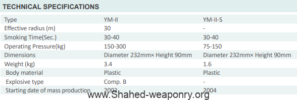 APPLICATION (YM-II) This kind of anti-vehicle and anti-light tank mine operates when an armored vehicle crosses it over. It is extremely resistant against FAE explosion. Anti-shock ability, high explosion force, high damages, easy arming and defusing and simple construction are its advantages. This mine is fitted with a pressure fuze and provided with a double anti-shock device.APPLICATION (YM-II-S) YM-II-S can be used for training, warning or alert during military maneuvers. This mine can be laid like normal anti- vehicle mines and operates when an armored vehicle crosses it over and then will release the smoke. There are four types of this mine in four different colors: red, blue, orange and green marked by their pressure plate color. These mines are used to evaluate the performance of mine fields and army.