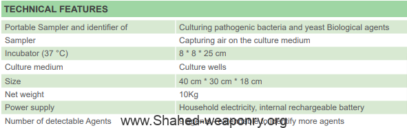 DESCRIPTIONSampler and identifier of biological agents in the air using the culture method is a complete set intended for identification of bacterial pathogens suspended in the air. This system operates on the principle of using the culture method as the gold standard for identification of pathogenic bacteria. This system captures the contaminated air directly on a culture and prepares a suitable medium for pathogenic bacteria to grow on. The culture is then moved to an incubator at 37 °C. After a sufficient period of time, the presence of pathogenic bacteria can be detected. Bacteria on the culture medium are distinguishable based on the color of the colonies. A variety of species including E. coli ,Klebsiella ,Proteus , Pseudomonas ,Acinetobacter ,Stenotrophomonas ,Enterococcus ,S.aureus ,S. epidermidis ,S.saprophyticus ,Strep B, Salmonella, Listeria, Candida, Vibrio, Yersinia, and Candida albicans develop colonies with different colors on the surface of the medium used. This set is packed in a shockproof and is easily portable by individuals.