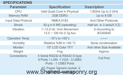 DESCRIPTION●NCD-301 Navnet designed in compact case to monitor and controlling all navigation systems with I/O data ports in serial and network protocols. That is designed to portable easy mobility and mountable on static stand. Integrated powerful processor and display hardware help to use in all systems for processing and monitoring devices ●Input /output data ports in serial RS232 and RS422 , LAN , USB2 – 3 protocols are available .●save and recording data from multi connected devices ●Environment IEC60945 standard.