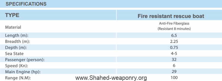 The main application of the lifeboat is for rescue operations on offshore platforms and could be utilized for all different types of vessels. The boat has been inspected and approved by Classification Society from quality point of view. This vessel has a sealed cockpit with a capacity of 32 seats and is designed and manufactured to rescue maximum 32 persons from emergency conditions. The vessel can be used for 8 minutes to rescue the crew. All the hatches of the vessel will be closed during the rescue and the needed oxygen for the crew will be provided by the oxygen capsules inside the vessel. Fire resistant rescue boat is equipped with the advanced internal and external communication, electronic, warning system to send signals which are used to ask for help in emergency states. All the internal equipment is according to the rules of SOLAS. The power is provided by one 29 HP engine. Fire resistant rescue boat is designed that if overturned for any reason, the vessel would be able to turn back to the primary state. If the engine of the vessel is broken down by any reason, it would be possible to use the oars inside the vessel. The speed of the vessel is 6 knots.