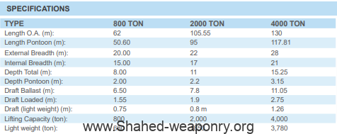 DESCRIPTION800 TON FLOATING DOCKS The 800 LC Floating Dock is designed for docking of ships up to 800 tons lightweight at a sea water density of 1025 kg/m3 by means of three transverse bulk heads and one longitudinal bulk head, the dock is divided into 8 water tight compartments. The dock’s hull cross section is U-shaped and has a flat bottom construction and two platforms at fore and aft the hull and the superstructure of the dock are of an all-welded construction and are made of marine steel grade. grade “A” shipbuilding, certified by Lloyd’s register of shipping.DESCRIPTION4000 TON FLOATING DOCKS The 4000 LC Floating Dock is designed for docking of ships up to 4000 tons lightweight at a sea water density of 1025 kg/m3. There will be 700 tons ballast water available in the ballast tanks for the compensation of trim and heel and for reduction of the longitudinal deflection. Discharge of compensation ballast water can increase the lifting capacity up to about 4700 tons under certain circumstances. The metacentric height will be 2.5m when docking a ship weighing 4000 tons and has a center of gravity 9m above the keel blocks, when the bottom of the ship is at water level for weighting 4000 tons approximately. All kinds of our floating docks can be used for repairing of different type of military vessels and also used to prevent them from sinking in the sea.