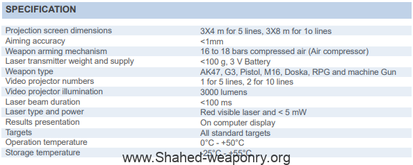 SIMULATORS INTRODUCTIONNowadays, using of training simulators are developing in many fields such as science, industry, military and so on which are most useful procedure to enhance people’s skills for operating systems.Military simulators are most useful devices for training armies due to decreasing the costs, preventing from ammunition lost because it is not necessary to use real ammunition, real vehicles, and real field. Also this training procedure prevents harms to people and devices.SIMULATOR CAPABILITYGeneration of virtual reality by computer graphics ● Generation of optional scenarios simulated for different battlefields and Day/Night operations ● Repeated use of scenarios to develop trainees’ skills. ● Cost reduction, time saving, preventing damages to people ● No need to use main weapons and real targets.FIREARM TRAINING SIMULATORFTS-I-12 is used for training shooters and developing their skills on speed, aiming and accuracy with different firearms. All weapons are modified for recoil and shooting like real weapons. Advanced software can generate a virtual reality of battlefield and targets such as terrain, vehicles, and soldiers and …. Features: ● 5 or 10 shooters can be trained with different or same weapons at the same time in fire line with shooter and assigned weapon definable. ● Simulation 10 types of firearms (RPG, Doska, Machine Gun, Kalashnikov, G3, Draganove, M16, Pistol, 60 mm mortar) ● Recoil and rate of fire simulation and considering ballistics to have real situation such as wind effect on projectile. ● 2D & 3D software to design different battlefield tactical scenarios ● Simulated different fixed and moving aerial, on ground and sea targets ● Recording of hand vibration graphs during shooting ● Registering shooter scores and presentation of work reports for each trainee, presentation of impact effects ● Cost saving and preventing from damages since it does not use real ammunitions.