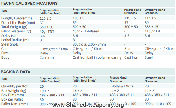 This family of products is a high quality grenade having both blast and fragmentation effects and designed for using against person or material in a close combat. In this product the fuze consists of a delay pyrotechnics charge above a detonator. Fragmentation: The body which is made of cast iron will act as fragments after blast. Steel shots: It achieves incapacitation of injury within a range of 8 m of the burst point, as the result of high velocity dispersion of steel shots. Offensive: This type of product has no fragmentation and is used as an offensive grenade. Practice: The Practice hand grenade has the same shape and size of fragmentation type but in blue color body and without any steel shots or explosives and the smoke material is HC and the body can be used in several times.