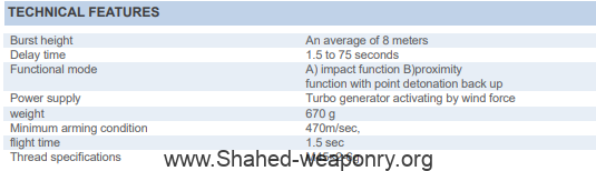 DESCRIPTIONIt is used in warhead of 122mm standard M122-K rocket.FEATURESMore area of destruction: Destruction area in proximity is three times more than impact fuze. Desirable performance of proximity fuze happens in targets where impact performance is very low like in ground covered by snow, soft ground, marsh, salt marsh, and on the water.SAFETIESIt is used in warhead of 122mm standard M122-K rocket.FEATURESSafety in transportation, storage, and firing according to:●S&A manual switch●Primary electronic delay of 1.5 sec●Selectable electronic delay in proximity function●Using wind turbo generator