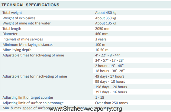 Maham 2 is a stationary self-contained bottom mine with two magnetic & non-directional acoustic sensors. The mine’s safety system is very reliable and simple presenting good performance. When the mine is placed in water, its safety system activates the mine and provides suitable delay time. Its arming system arms the mine after activation of the safety system in depth of more than 10 meters. An antisweeping system has been installed in the mine’s electronic system as a vessel counting circuit. The mine which contains 350 kg explosive charge could be placed on sea bed in depth of 10-50 meters to destroy submarines and surface vessels (ships) with a weight of more than 250 tons. The mine can be transported and laid by various types of ships.