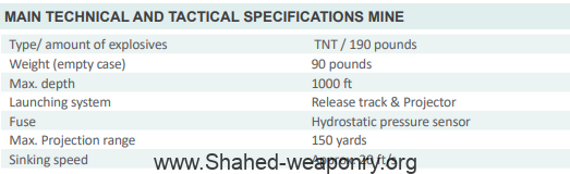 Maham 6 is a depth charge used as an Anti-Submarine Weapon (ASW). The mine can be laid by surface ships equipped with a projector (max. distance of 150 yards) or a release track. The design of its nose and tail gives it a tear-drop shape which provides the lowest resistance to water. PERFORMANCE This weapon is composed of safety and arming device, explosive train, battery and electronic board, electronic hydrostatic sensor, explosive charge and body. As soon as launching the mine into water, it sinks and is armed in the depth of 15m. Then the system is activated by reaching pre-set depth and is exploded. If the charge is not exploded for any reason, the mine will be exploded after passing the specified time (that is adjusted by the timer). All adjusted operations are done by selectors installed on the mine. Three selectors have been considered for setting of numbers ones, tens and hundreds of depth performance and also one selector has been considered for adjusting time of self-destruction on the panel.