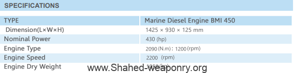 The BMI 450 diesel marine engine are subgraded and modified in Iran to be used in marine vessels up to 450 hp. The improved items in this engine are the heat exchanger design, ECU, and its possibility to have constant torque at different engine speeds and optimum performance in Persian Gulf climate pointed out. This engine can be utilized for various applications, such as medium use for patrol, passenger and cargo vessels.