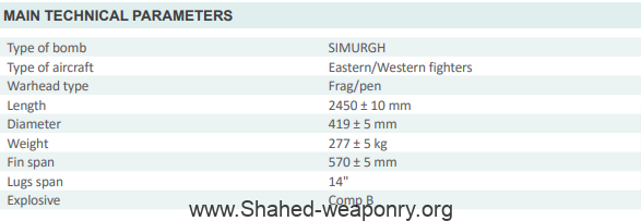SIMURGH CLUSTER BOMB Simurgh cluster bomb is an advanced weapon which causes relatively high destruction in attacks from low altitude. Among other features, its high destruction power is effective against a variety of armored and non-armored targets. The bomb contains 147 bomblets, each weighting 1kg. The body of the bomblet is fragmenting which increases its effectiveness against armored and non-armored targets. Besides, the existence of shaped charge increases the effectiveness of the bomb against armored targets.