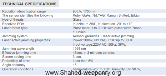 OPERATION CONCEPTThis system may be used to countermeasure laser-guided bombs and laser-guided missiles. It employs the combined countermeasure of laser active jamming and laser passive jamming to blind the approaching laser-guided weapons or decoy them as pseudo-target so that the valuable target can be protected effectively. It assists protection of significant vehicles of command posts such as command vehicles, missile launcher trucks and valuable military targets like hubs of communications and important installations of C3I.The system is able to employ module combination, be extended according to the area and shape of targets to be protectedFEATURES● All-round (360˚) detection of laser targets. ● Smoke screen is available in manual and automatic mode. ● Equipped with laser source to jam threats. ● Angle of threat is illustrated by computer. ● Computer commander software to communicate ingredients of the system. ● Furnished with reflector for scattering laser beam.STANDARD ACCESSORIES● All-round (360˚) detection of laser targets. ● Smoke screen is available in manual and automatic mode. ● Equipped with laser source to jam threats. ● Angle of threat is illustrated by computer. ● Computer commander software to communicate ingredients of the system. ● Furnished with reflector for scattering laser beam. ● Carrying case. ● Instruction manual. ● Aerosol grenades
