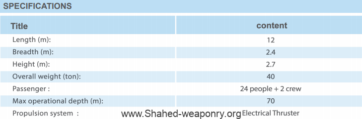 The submarine was proposed for development of tourism industry and is under construction by MIO’s experts under the supervision of the International Classification Institute. The submarine includes equipment such as: Telecommunication and wireless system, underwater telephone, welfare, security and rescue facilities.