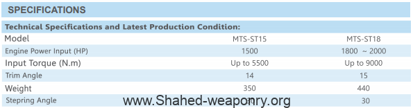 Marine tech. surface-drive system (MTS) is designed by Iranian engineers of MIO to be used in all high speed craft. It has three types of design that make it suitable for all kinds of boat transom. MTS can be used for all types of pleasure crafts as well as the most demanding sport boat applications, by choosing the appropriate gear ratio and propeller to match the respective hydrodynamic characteristics of the hull and the performance characteristics of the engine. It can also be easily fitted to any boat transom which could accommodate a typical stern-drive or inboard driveline with shaft angle between 3o – 10o. This is a great benefit for boat builders who need to fit the propulsion system according to the customers’ preference. When the hull is finished, Marine Tech surface drive design and production process are considered throughout the design and development of this product and careful attention is paid to ensure the desired goals related to functional operation, ease of maintenance, reliability and efficiency. The design is developed using modern 3D solid computer modelling with integrated structural Finite Element Analysis to optimize the design geometry and design stresses. In addition, the drivelines instrumented prototypes are bench tested under representative loading conditions. The technical feature is trimmed (+4o- -10o). It has the ability to trim up and down. The MIO Steerable Surface Drives allows the propeller draft to match the engine horsepower output; thus more power is converted in producing thrust, while the engine is operating closer to its rated power curve. Propeller draft can be adjusted while underway, achieving the optimum thrust angle in any load and sea condition. The Steerability is (±15°). Steering control and response is maximized when the propellers function is in the directional force. MTS steerable surface drives directly set the propellers angle in the appropriate direction of motion. The MTS systems can close-haul the turn, with greater control than fixed shaft drives; and the manoeuvrability is the best at any speed. Steering is power assisted via an engine driven pump located on the engine. For safety reasons a double power steering pump installation is always suggested. Advantages: 1.Propeller shaft manufactured with superior quality stainless steel 2. Simplified installation procedure 3. shaft trim angle ±15° Steering angle 15 – 30% speed increase over conventional systems 4. 15 – 30% increase in fuel efficiency 5. Shallow water maneuverability 6. Reduced cavitation on Propellers 7. Positive thrust steering – superior maneuverability 8. Greater flexibility of engine placement 9. Less vibration – smoother running condition 10.The proven performance and reliability for all crafts ranging from 30 up to 100 mater