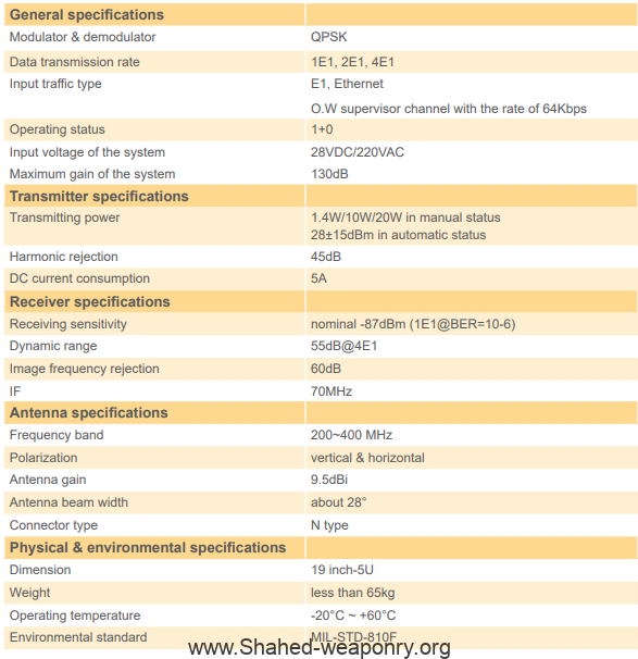 High capacity transportable radio communication systems are considered specially for transmitting high capacity information from tactical areas to operational commander levels. Whereas the communication services including single-channel communication equipment operated in tactical zones do not meet needs of brigades and divisions in operational areas, usually high capacity point-to-point transportable radio communication systems are benefited from higher level communication services. zTRC-421/E provides capability of establishing full duplex telephone communication, exchanging data/image with maximum capacity of 8Mbps in the UHF frequency range. In case that the capacity is used only for telephone communication, 128 subscribers can make high quality call. All of the exchanged information including voice, data, and image are encrypted by an advanced encryption unit, before being exchanged. Due to network interfaces, the two LAN networks available in both sides can be connected to each other via this transportable radio communication system. Frequency range of the TRC-421/E is a wide range of 225~400 MHz specified proportionate to distance of the two points, terrain, and exact operational frequency. In addition to operating the radio as a point-to-point radio, it can be used as a repeater for increasing communication distance.