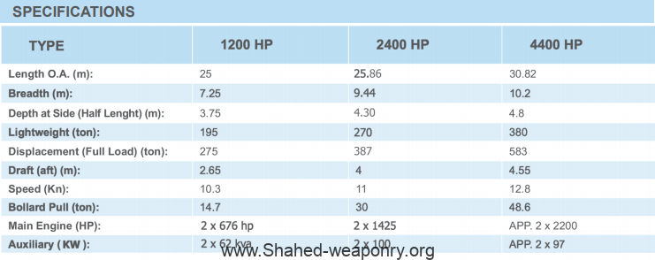 TUG BOAT 1200 HPThis vessel is a modem seagoing twin crew tug/work boat for coastal waters and features a compact deckhouse on the fore deck with a top deck placed at the wheel house and a large aft deck with a specific load of 2 ton/m2. The single hull and the superstructure are all welded construction and are made of marine steel materials. The vessel is of Grade “A” shipbuilding level, certified by Lloyds Register. All materials and equipment are marine type and appropriate for this kind of vessel. The deck house accommodates officers and crew for a total of 8 persons. The vessel is propelled by two marine diesel engines, each driving a fixed pitch propeller in a fixed nozzle. These engines have a closed cooling water system and air started.TUG BOAT 2400 HP This vessel is equipped with suitable pumps, air conditioning and ventilation, air compressors, modern navigation system, hydraulic system as well as electrical system on the aft deck. A hydraulic crane and a hydraulic towing winch are also fitted. The vessel is manufactured under supervision and according to the rules of LR Classification Society.TUG BOAT 4400 HP This vessel is an azimuth stern drive tug and a highly manoeuvrable high performance tug of modern design. The propulsion consists of two main engines, air started and box cooled, with two steerable rudder propeller units with fixed pitch propellers in nozzles that are mounted in the ship aft. The vessel is designed for towing on the hook, pulling and pushing operations and can be used for harbour, coastal berthing operation and offshore towing, including fire fighting.