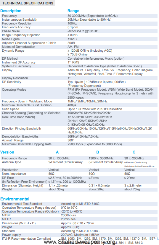 GENERAL DESCRIPTION This system with extremely high scan speed is designed by making use of the latest technology in the field of military communications. This system can intercept and find the direction of frequency/time hopping, burst and fixed frequency signals in the wide frequency range from 30MHz to 3000MHz. This system uses correlative interferometry algorithm. The antennas are designed for in stationary and semi-mobile applications. Using of large aperture antennas with nine elements, the system can reach highly accurate bearings. For better accuracy the DF consists of three antenna sets, which are arranged for three sub-band frequency. One set of nine elements antenna covers 30-200MHz frequency band, set of nine elements antenna covers 30-1300MHz and another set of eight elements antenna covers 1300-3000MHz frequency band. Overall system is protected against lightning that prevents it from natural malfunctions.FEATURES ● High-speed direction finding using correlative interferometer algorithm ● Simultaneous direction finding of wide-band (FH/Burst) and narrow-band signals ● Excellent resistance against powerful signals ● Appropriate diversity of antennas to cover frequency band ● Enhanced DF accuracy and sensitivity by using wide aperture DF antennas ● Extremely high frequency resolution ● Direction finding of all narrow-band digital and analog modulated signals ● Simultaneous direction finding of three frequency-hopping signals with 2500hops/S in 20MHz bandwidth ● Networking capability for position finding ● Direction finding of the burst signals with the time duration more than 400µsec. ● Equipped with GPS receiver for time synchronization ● Automatically correct the error difference angle with respect to magnetic north by compass ● Demodulation of the AM and FM signals. ● Self-test ability with the error and its fault status determination ● User-Friendly GUI ● Appropriate weight and dimensions ● Tactical and stationary application ● Scale indicating ● Able to arrange any DF system on the map ● Possibility to add or delete layers on the map ● Capability to show a map in vector or raster shape in infinitive multi-layer ● Printing ability